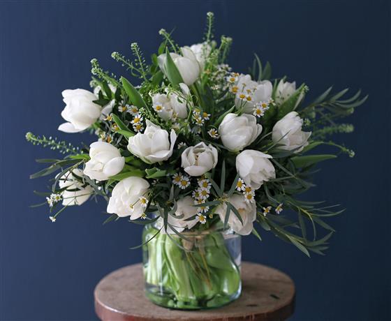 A glass vase filled with tulips and seasonal foliage's and filler flowers.
