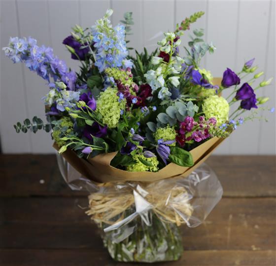 A hand tied bouquet of Purples, Blues and Limes.