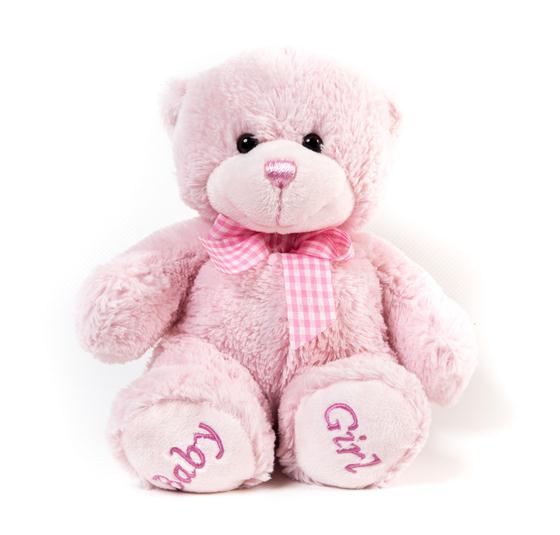 A gift collection of a hand-tied bouquet in pastel pink and white shades, an 'It's a Girl' balloon and a baby pink bear.
