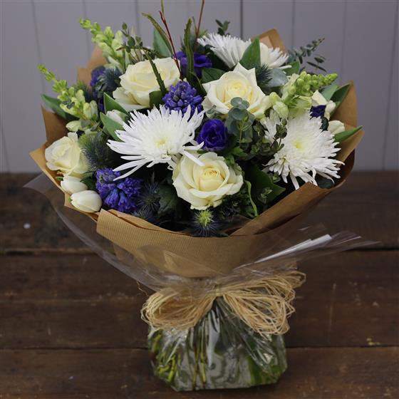 A beautiful seasonal selection of true blue and white flowers compllimented with foliages.
