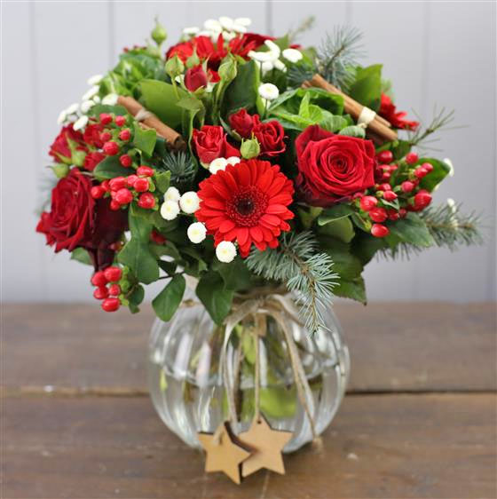 A beautiful Christmas bouquet with deep reds, whites and winter foliage.