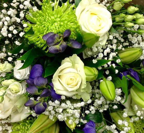 White roses, green chrysanthemums, lilies, gypsophila and purple aconitum make a classic all year round selection.
