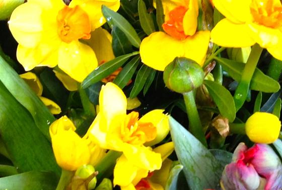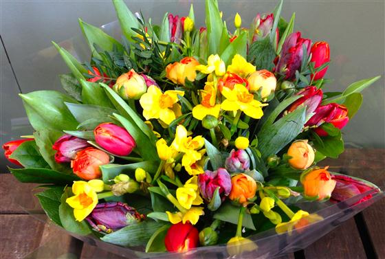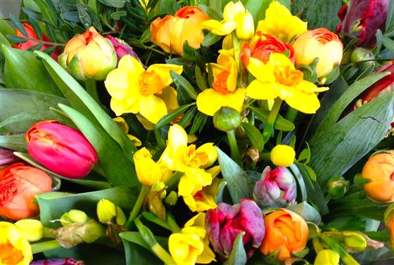 A beautiful array of spring flowers including tulips, ranunculus and scented golden narcissus.