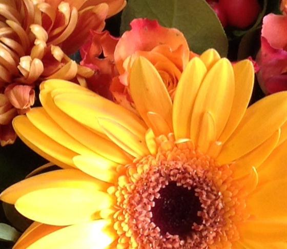 Autumn single chrysanthemum blooms, hypericum berries, gold gerberas and roses, create a warm autumn bouquet.