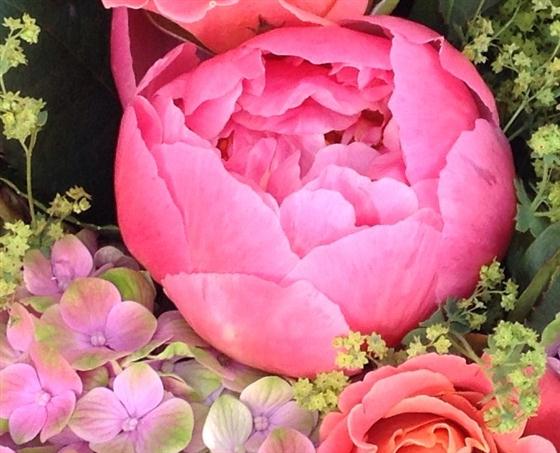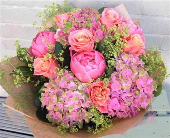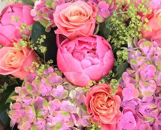 Stunning coral shades including roses, peonies and hydrangeas.