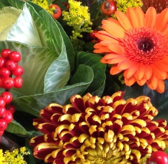 An abundant autumnal bouquet including mini gerberas, classic single chrysanthemums mixed with berries and golden solidaster.