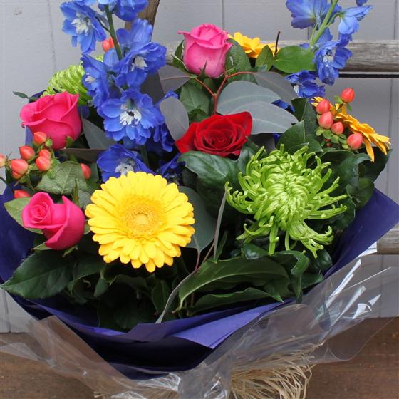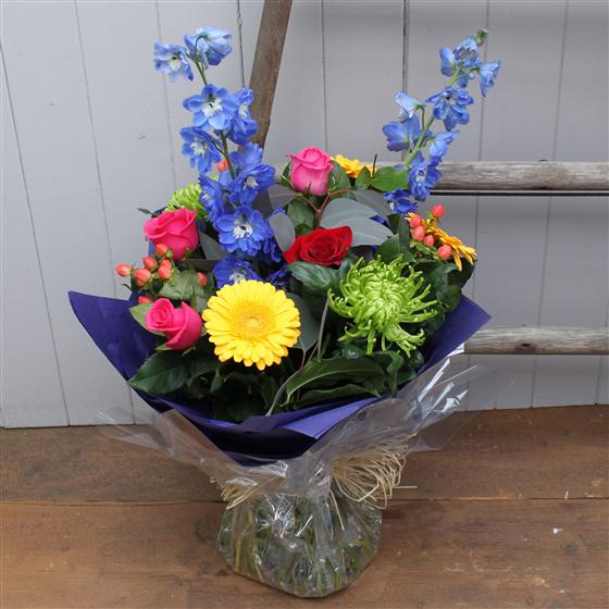 Delphinium in blue with bold and clashy summer flowers to compliment. Aromatic foliages come as standard. Sure to please.
