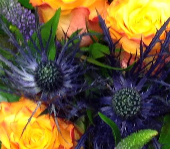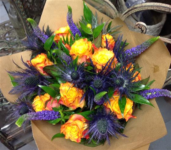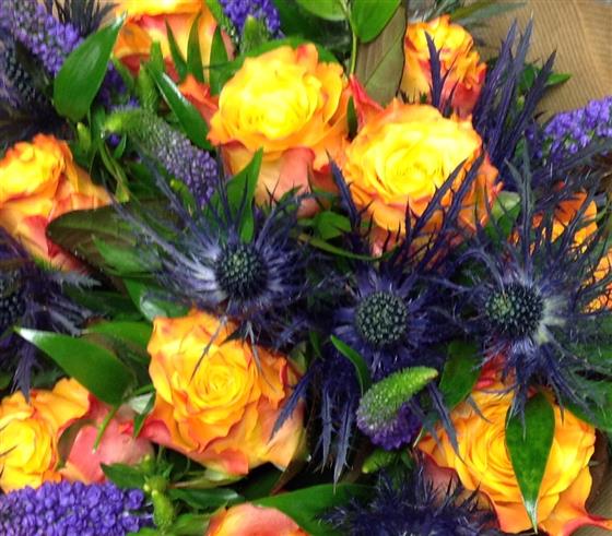 Striking vibrant display with the vibrant orange roses as the main feature.