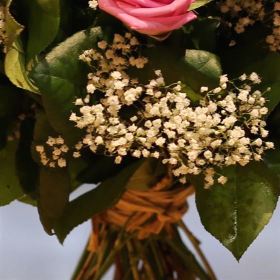 A classic gift of a dozen long stemmed pink roses, delicate gypsophila and mixed foliage, hand tied and presented in water.