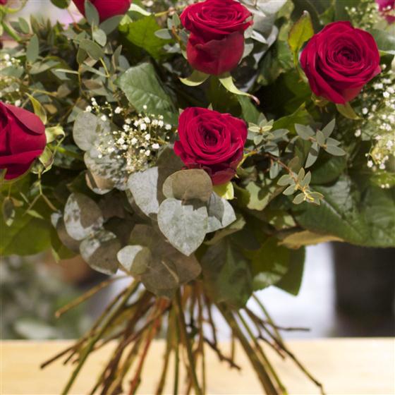 A dozen velvety red long stemmed roses are combined with gypsophila, eucalyptus and salal leaves to create this classic bouquet.