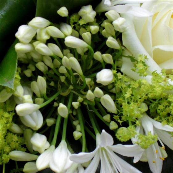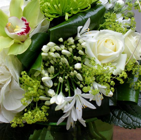 A glass globe vase filled with stylish whites, creams and greens. Hydrangeas, agapanthus, shamrock blooms and cymbidium orchids make up this gorgeous arrangement.