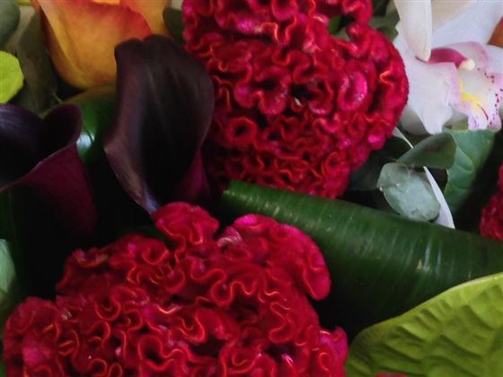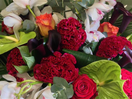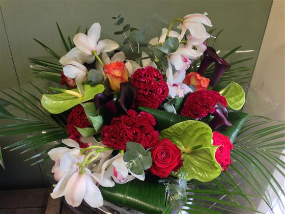 An exotic array of blooms including anthuriums, roses and orchids entwined to create an unusual bouquet finished with contemporary foliage.