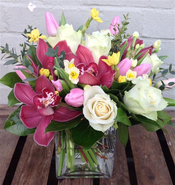 Beautiful spring vase display with tulips , narcissus and the addition of cymbidium orchid heads. Vase included in price.