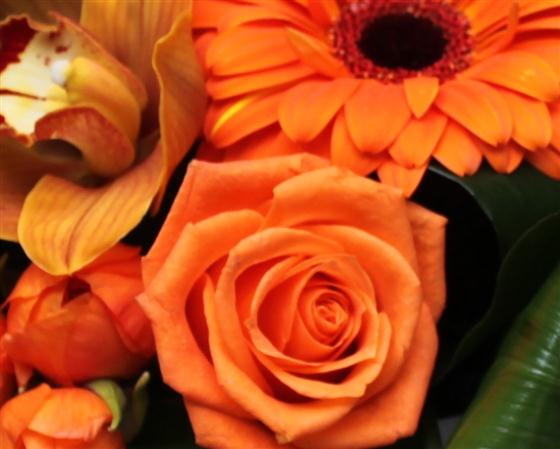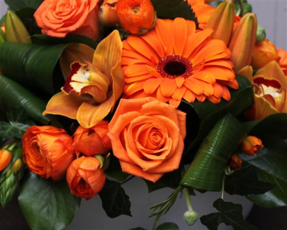 Orange roses, cymbidium orchids, gerberas and ranunulus combine with deep green aspidistra leaves to create this contemporary centre piece.