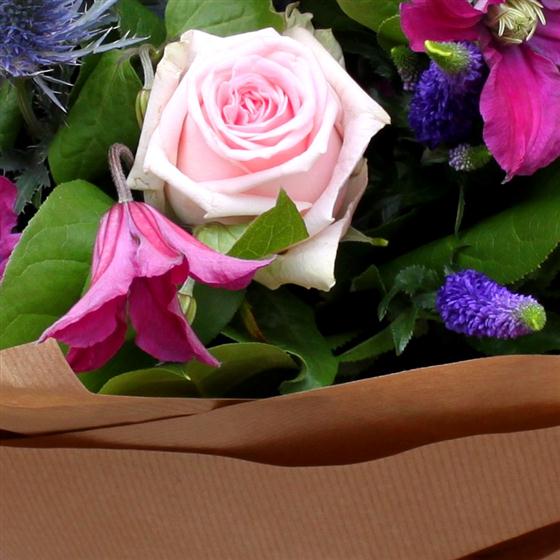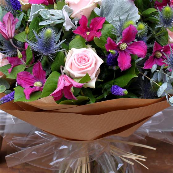 This pretty hand tied bouquet combines pinks, blues and purples including roses, eryngium and veronica to create a country style display.