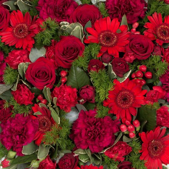 A florist choice coffin top casket spray arrangement of seasonal blooms. Choose from a range of colour options or contact us to discuss your requirements.