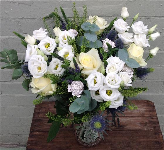 Wintery bouquet with white roses , blue thistles and white lissianthus.