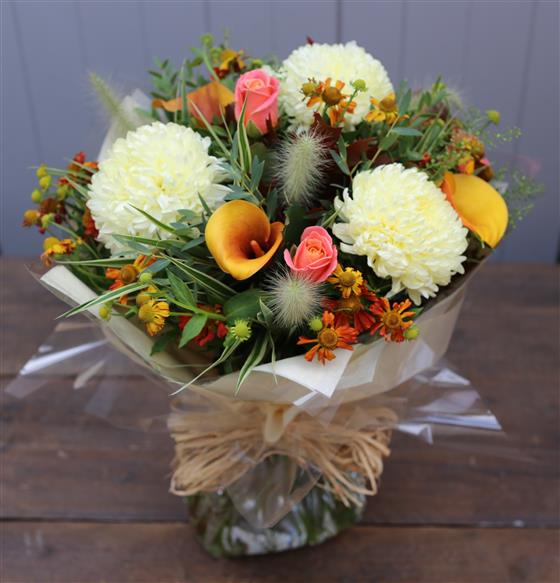 Cream chrysanthemum blooms, calla lilies and roses create this classic hand tied bouquet.