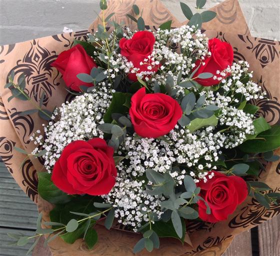 6 long stemmed freedom roses with gyp and mixed foliage.