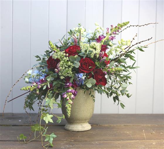 A stone urn filled with red roses, snap dragons, delphiniums and interesting foliages in a contemporary design. Urn may vary from picture shown.