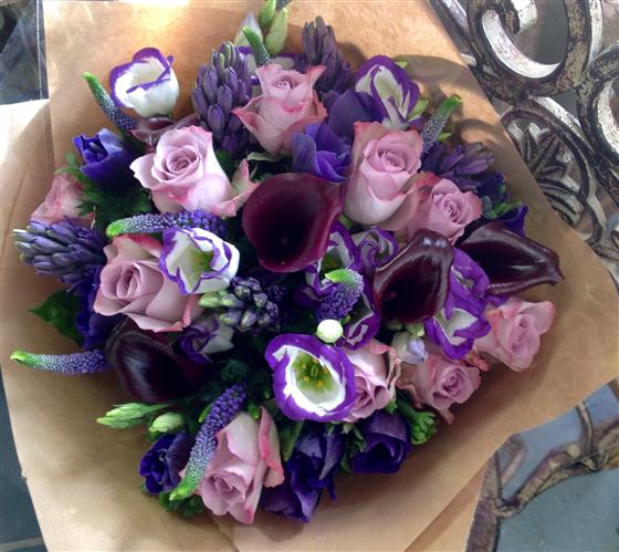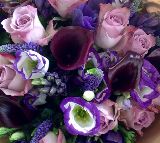 Stunning purple shades in this bouquet. Including roses, lisianthus, calla lilies and other seasonal purple flowers.