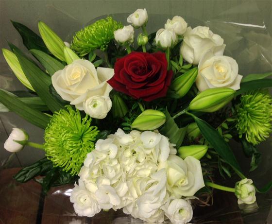 Classic white selection of lilies, white roses, white hydrangea and a single red rose in the centre.