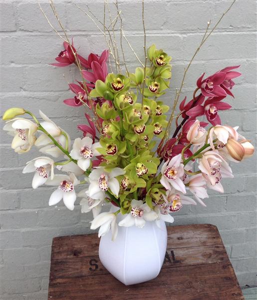 Vase of beautiful mixed cymbidium orchids.