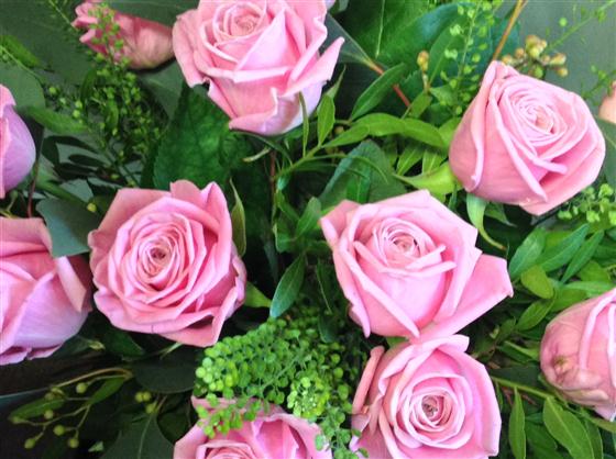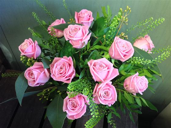 12 Soft pink roses in a hand tied bouquet.