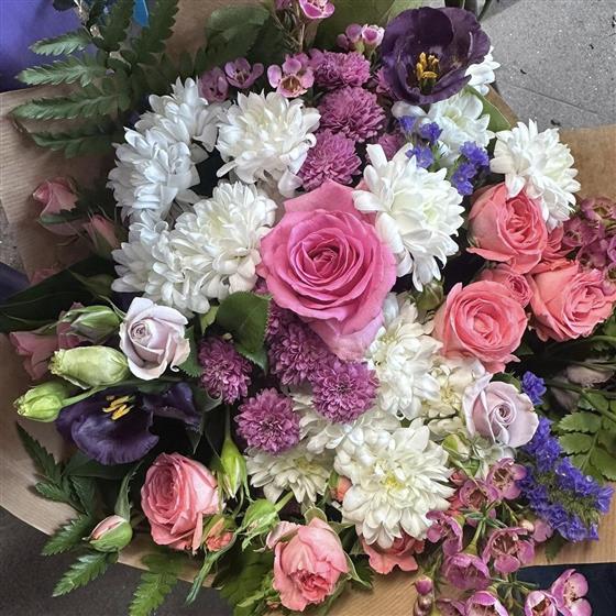Blending soft pink and blush-toned roses with textured chrysanthemums, waxflower, lisianthus, and delicate seasonal accents, this bouquet offers a layered, elegant composition, expertly arranged by Dalwish flower delivery to feel modern, refined, and beautifully balanced.