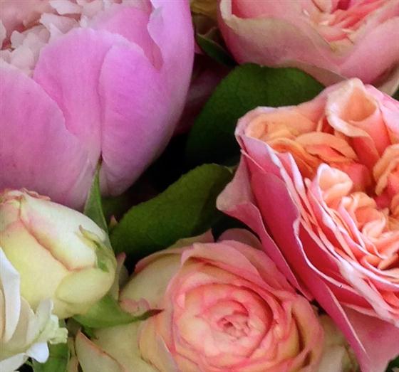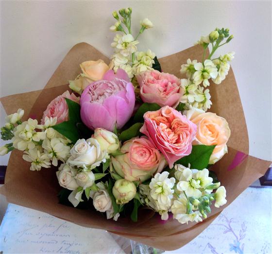 A summer gift of soft pastel roses, peonies and stocks. Simple and elegant.