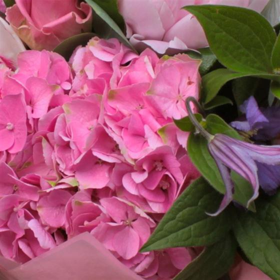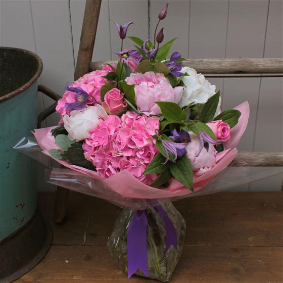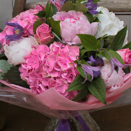 Blousy Pink Hydrangeas, Peonies, Chic White Hydrangeas and trendy Clematis are the ingredients of this beautifully made hand tied bouquet.