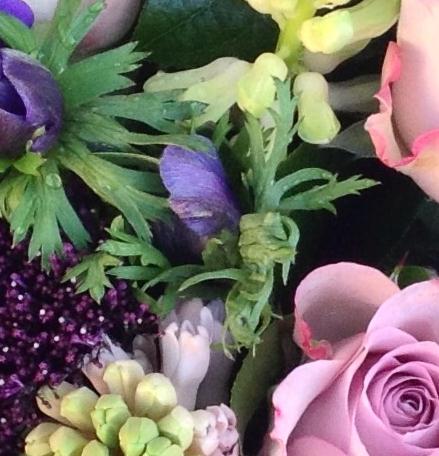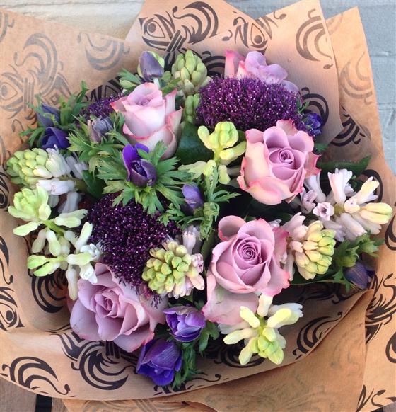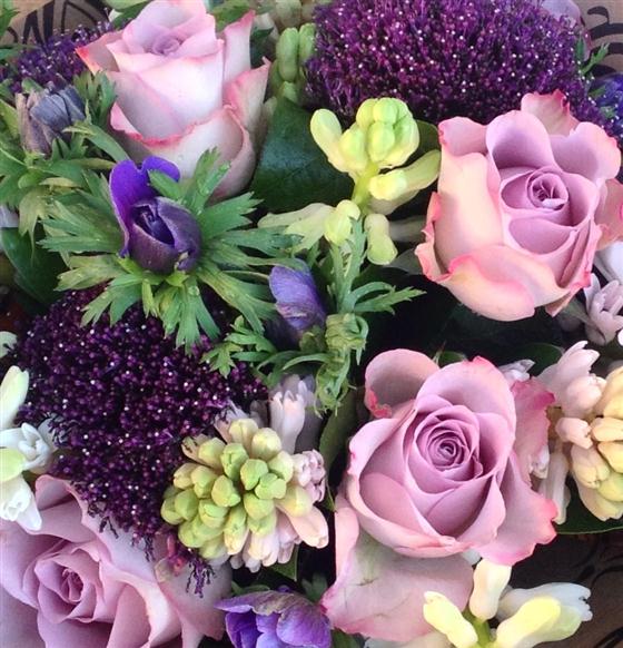 Wonderful selection of lilac roses, blue anemones, hyacinths and other seasonal fillers.