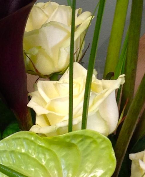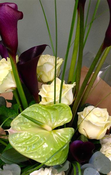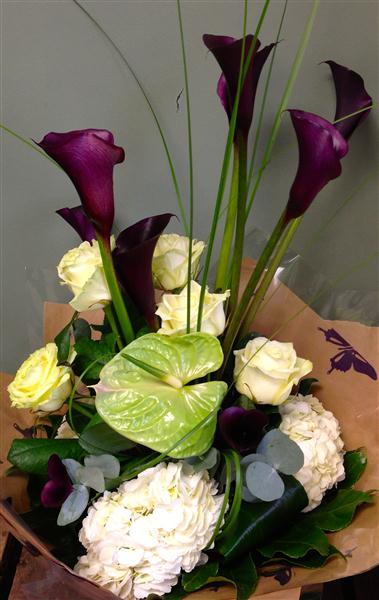 A modern array of calla lilies, anthuriums, roses and hydrangeas presented with contemporary foliage.