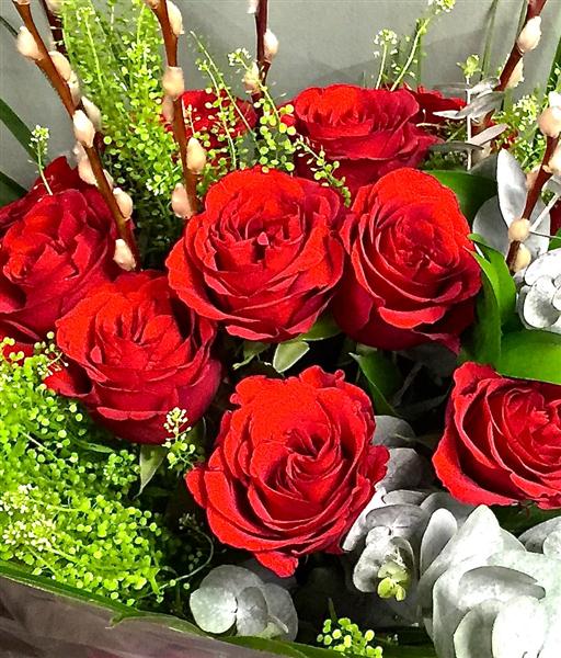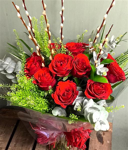 A dozen beautiful red eagle luxury rose handtied bouquet with pussy willow, eucalyptus and thalaspi. Red eagle is grown in Holland and is guaranteed to last for 7 days. Long stemmed and a large pillar box red.
