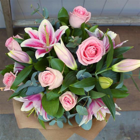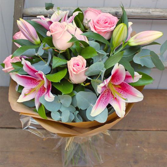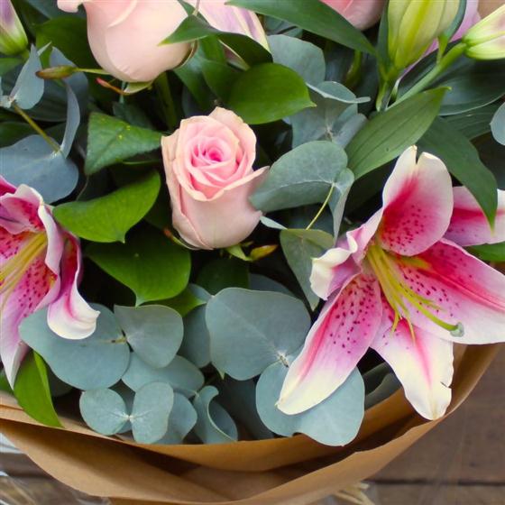 Oriental lilies and six pink roses are combined with eucalyptus and seasonal foliage to create this pretty, scented bouquet.