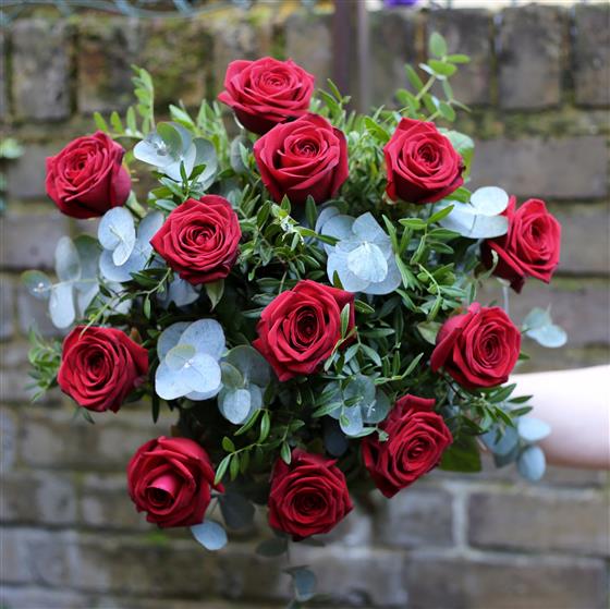 12 Beautiful red roses expertly hand tied and complimented with winter foliage's.