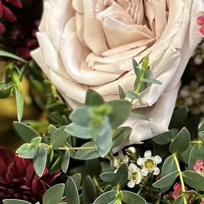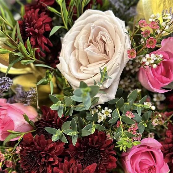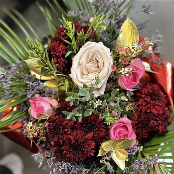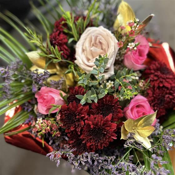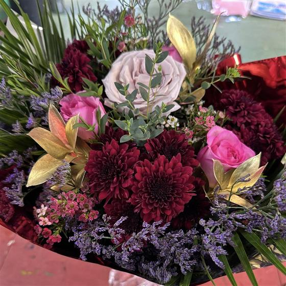 A luxurious mix of deep burgundy chrysanthemums, soft roses, delicate waxflower, statice, and eucalyptus with subtle gold accents creates a rich, dramatic arrangement, expertly styled by Dalwish flower delivery to feel opulent, modern, and unforgettable.