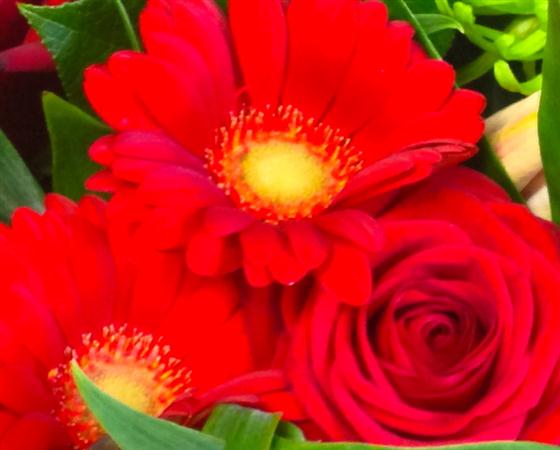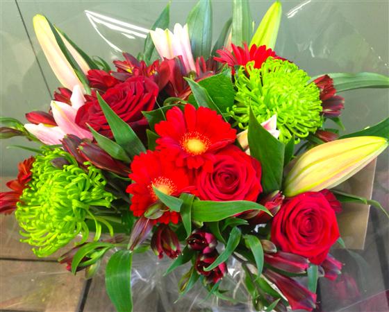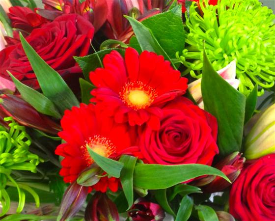 Ruby red gerberas, roses and alstromeria accented with scented lilies and vibrant lime green chrysanthemums.