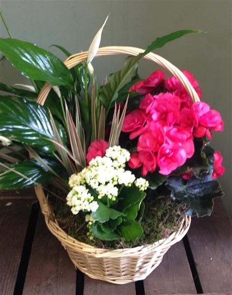 Traditional planted arrangement with a seasonal selection of indoor house plants.