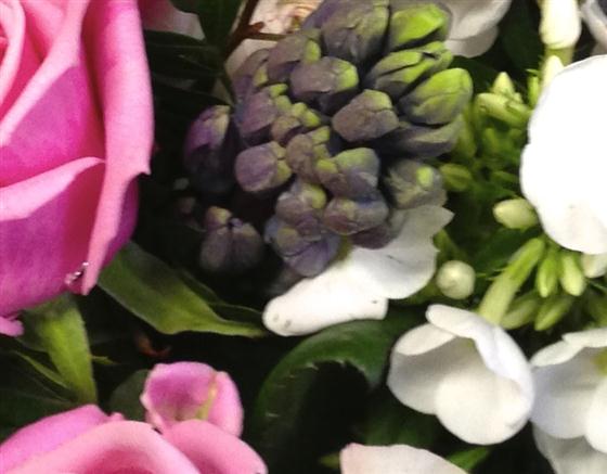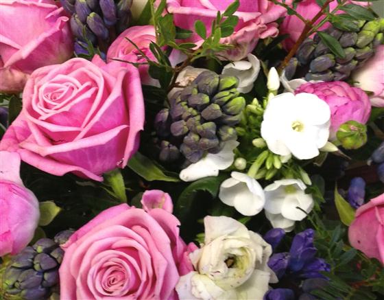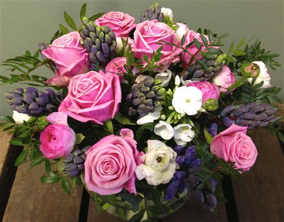 A pretty seasonal collection of scented hyacinths combined with pink aqua roses and ranunculus presented in a glass vase.