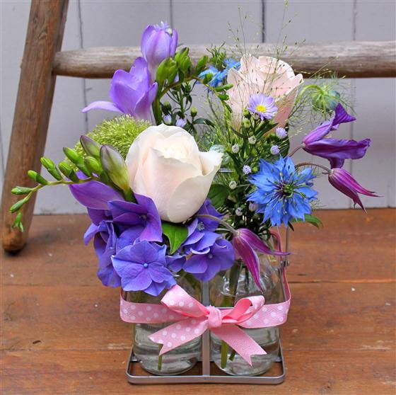 Looking for something different - this dinky set of 4 mini milk bottles in a tray is sure to please. Pretty blues, creams and purples give a vintage feel.