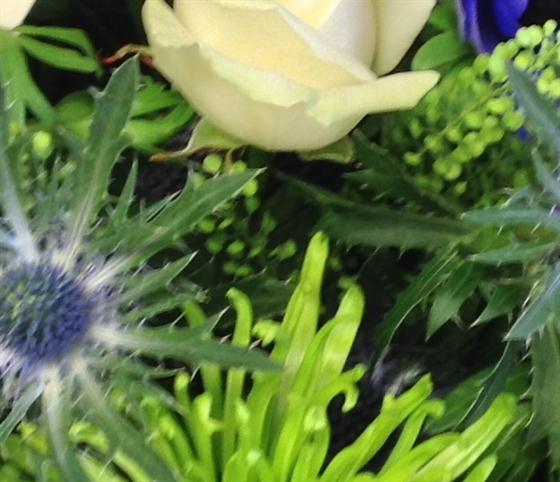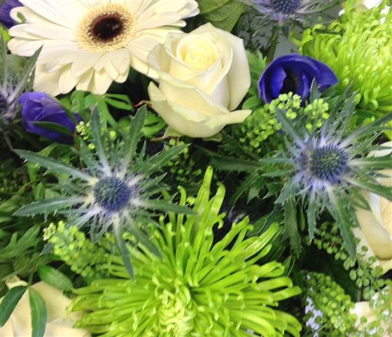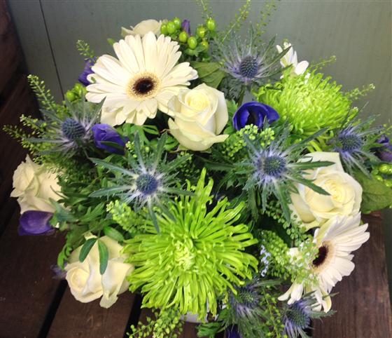 A simple colour palate of blues, whites and limes including anemones, eryngium, roses and gerberas presented as a hand-tied bouquet.