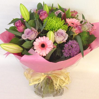 One of our most popular bouquets, pinks, lilacs and purples including roses, lilies and gerberas create this pretty collection.