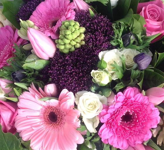 Lovely mix of pink and purple flowers including rose , gerberas and seasonal spring assortment
