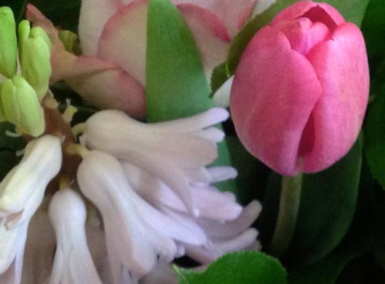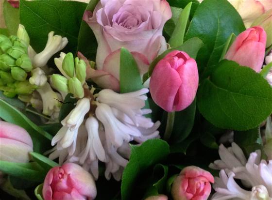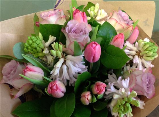 Soft tulips, scented hyacinths and delicate roses create this pretty, vintage style posy bouquet.