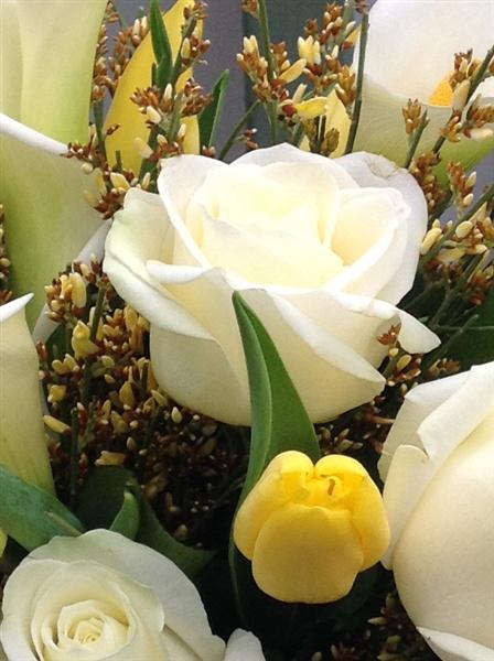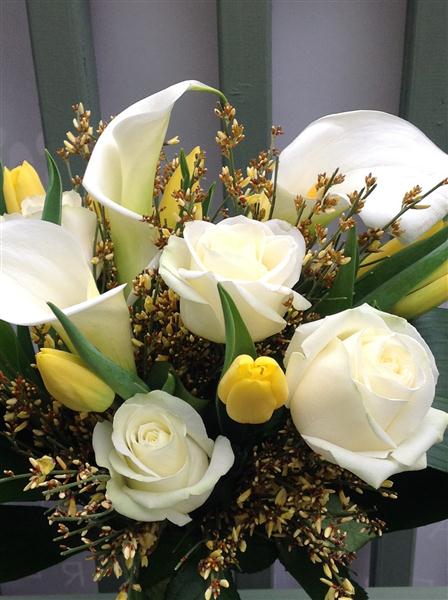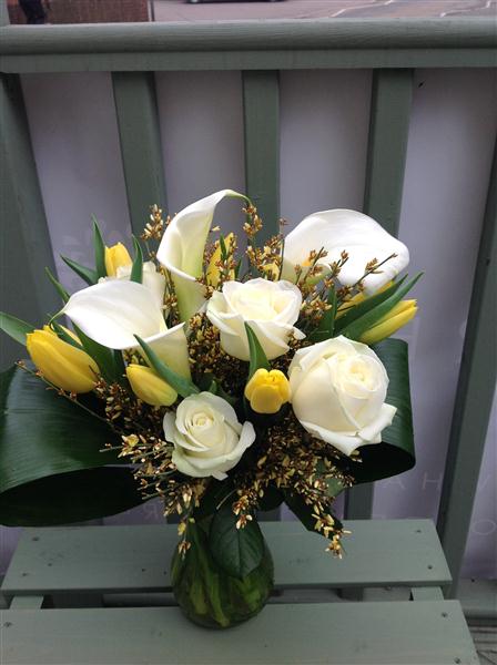Vase display of arum lillies, tulips and roses.