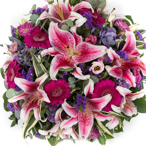 Scented stargazer lilies are the focal feature in this striking posy arrangement. Please give ample time when ordering to ensure lilies are in full bloom.