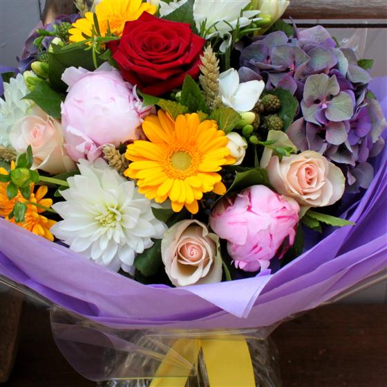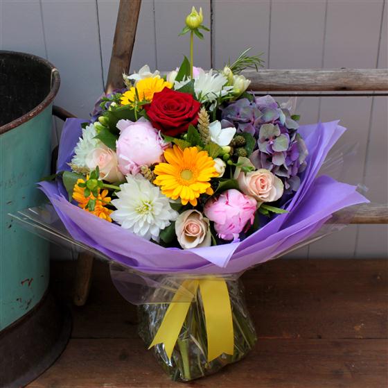 A beautiful domed hand tied bouquet in summery colours, with unusual and seasonal foliages and fillers. Delivered in water, this is sure to brighten up someones day!