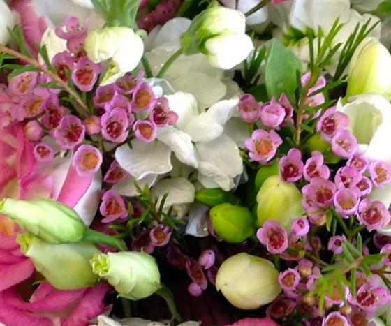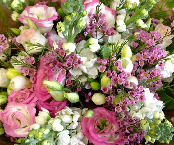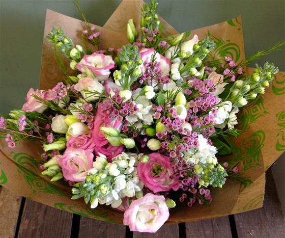 A country garden style bouquet of summer flowers including lisianthus, stocks, roses and delicate wax flower.