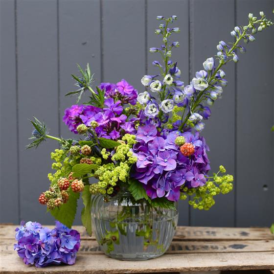 An over sized sweety jar filled with purple summer flowers in a country garden style